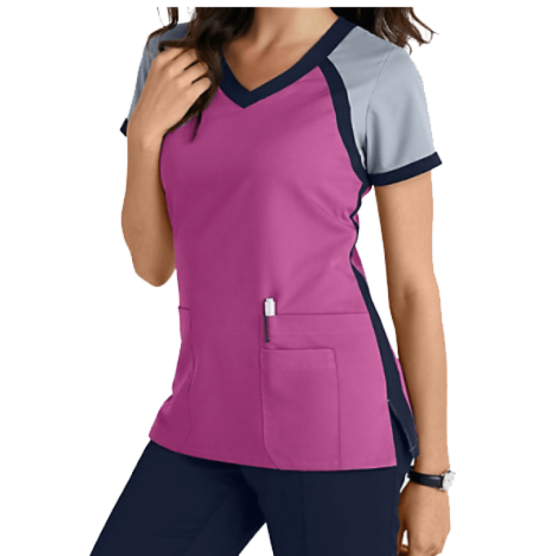 Conjunto M01 con cuello en V con un diseño destacado, mangas en diferente color y sesgos a contraste, cuenta con tres bolsillos amplios.